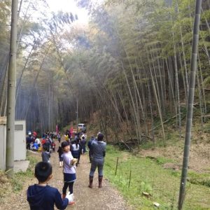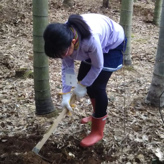 たけのこを見つけたら、まわりを掘って、最後に根元から掘り起こします。