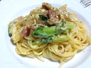 あり合わせのもので、カルボナーラ風パスタを作りました。
