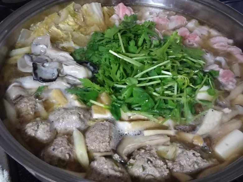 豚バラに牡蠣、イワシのつみれ、シメジにエリンギ。