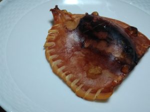 熱々のうちに、切れ目を入れたところから割いて食べます。