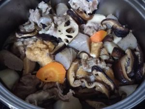 大根、にんじん、里芋、レンコン、こんにゃくに厚揚げ、干し椎茸など、