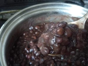 小豆が煮えてきたところで、お砂糖を2回くらいに分けて。