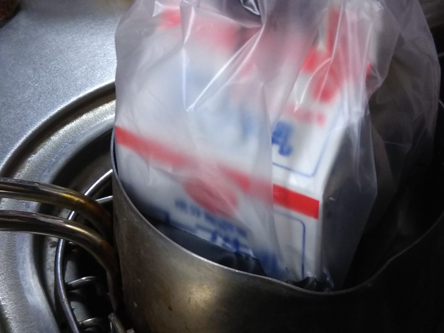 小鍋にお湯を沸かして、その中にパックを浸けて保温することに。