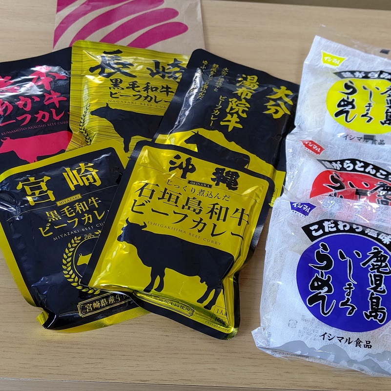 九州各県のレトルトカレーといしまるラーメンのアソート。