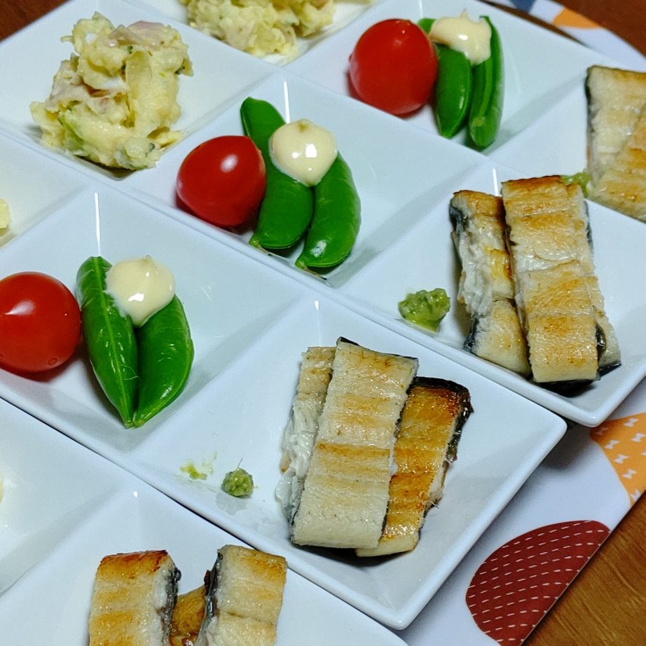 長島の新じゃがのサラダに、出水のスナップエンドウ、
