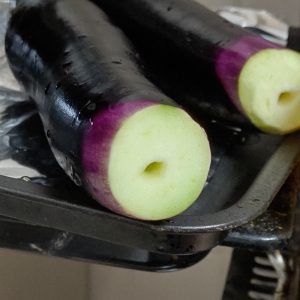 ヘタを落として、なすの真ん中に菜箸で穴を開けるのです。