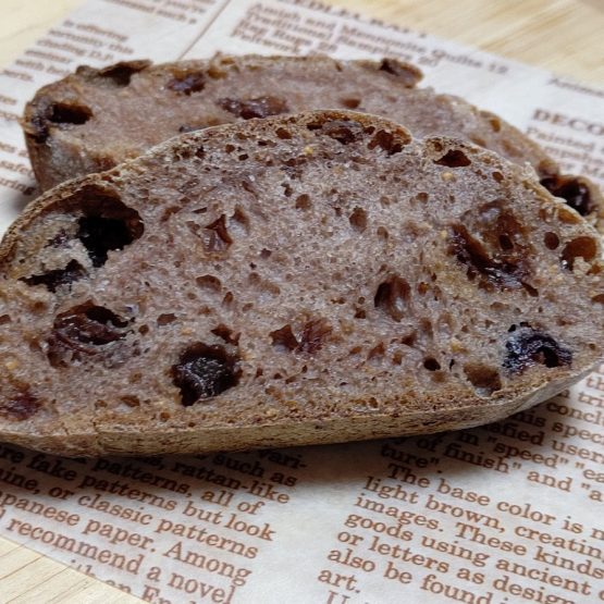 パン生地に赤ワインを使って、イチジクとかのドライフルーツたっぷり。