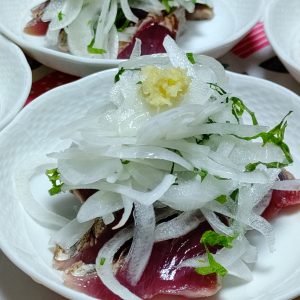 鰹のたたき 2021年04月09日2025年09月18日 ワイズプラス代表 森好子 新タマネギが出回るこの季節。 我が家でよく作るのが鰹のたたきです。 鰹はあっさりしているので、 新タマネギのスライスとおろし生姜をのせて、 ポン酢で食べます。 鰹のたたき 昨日もいい感じの鰹があったので、買ってきました。 皮付きで売られていることが多いので、 皮に数本切れ目を入れて、 トーチバーナーであぶってから切り分けます。 サラダ感覚で食べられるので、 我が家の息子が特にお気に入りです。 森好子