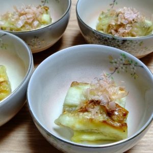 昨日の夕飯は、焼きなす。麻婆豆腐風、作り置きのミートローフでした。