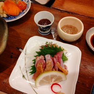 鳥刺しの上に写っているのは薬味。