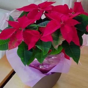 ポインセチアは鉢カバーに入れて、赤色のフィルムでラッピング。