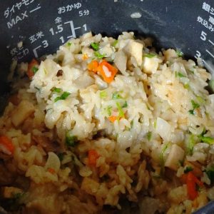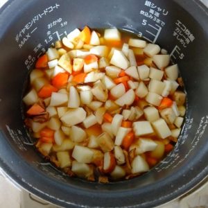 炊飯器に入れたら、お米の分の水、地酒、きび砂糖、お醤油を入れて、