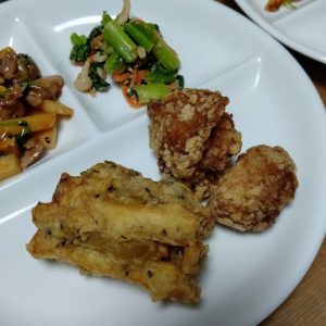 人気のガネとから揚げ、青菜の冷菜です。