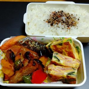 今日のお弁当は鮭に寿庵の黒豚みそ漬け、イタリアンオムレツのメニューです。