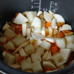 七草のずし 2024年01月07日2025年09月18日 ワイズプラス代表 森好子 本日は七草です。 ということで、いつもの七草セットを買ってきて、 七草のずしを作りました。 例年通り、炊飯器で炊く「ずし」です。 炊飯器にセット! 七草の他、お餅、にんじん、ごぼう、さといも、さつま揚げを入れました。 炊きあがったら、刻んだセリなどを混ぜて蒸らします。 今回、椎茸を入れるのを忘れてしまったので、 お正月用に甘辛く煮ておいた椎茸を刻んで入れました。 七草のずし これを食べて、 今年1年、家族が無病息災で過ごせますように。 森好子