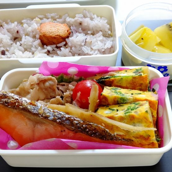 本日のお弁当は豚肉のしょうが焼き風とイタリアンオムレツと焼き鮭。