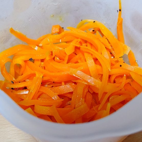 千切りにしたにんじんを軽く炒めてドレッシングで和えます。