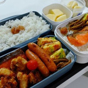 おかずはから揚げに焼き鮭にいつもの定番イタリアンオムレツ。