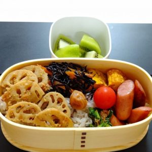 冷蔵庫にあるものなどを詰めた滋味地味弁当です。
