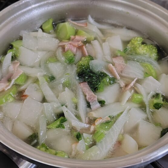 ベーコン、ブロッコリー、タマネギと一緒にコトコト。