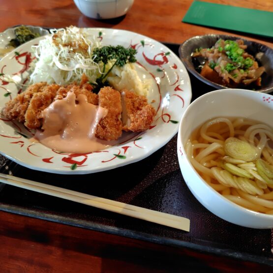 うどんは手打ちっぽいかんじ、付け合わせのポテサラもおいしい。