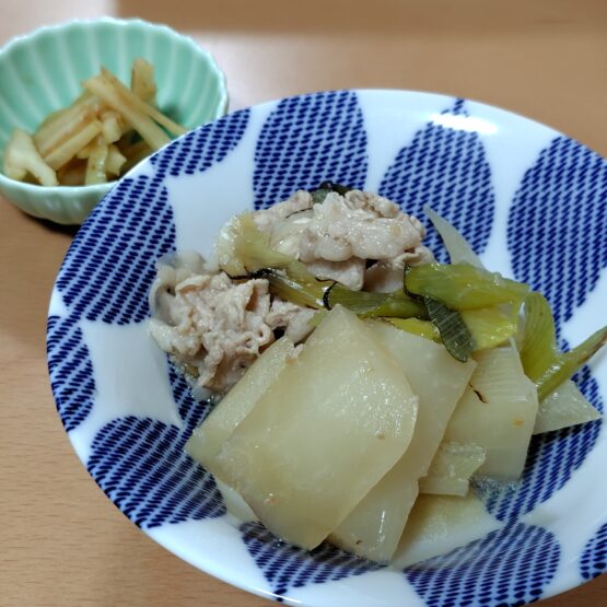 1.桜島大根は一口大の乱切り、長ネギは青いところも含めて、斜め切りにする。