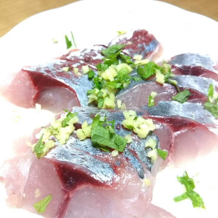 お刺身の上に刻んだ大葉とネギ、すり下ろし生姜をのせたものです。
