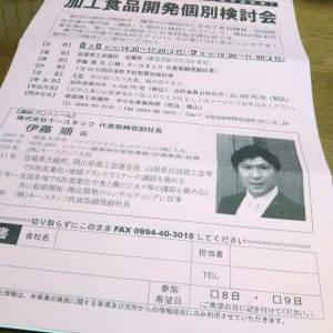 キースタッフ伊藤さんの相談会あります 2017年07月30日2025年09月30日 ワイズプラス代表 森好子 若手経営陣に代替わりしたキースタッフさんの 相談会が鹿屋商工会議所で開催されます。 加工食品開発相談会 鹿屋商工会議所の会員は5千円で相談することができます。 販路拡大や、商品開発などにお悩みの方、おすすめです。 森好子