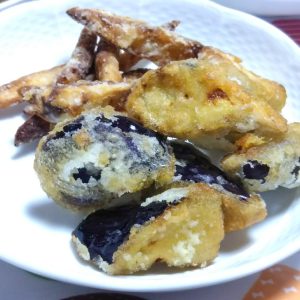 縞目に皮をむいたなすを一口大の乱切りにした後、