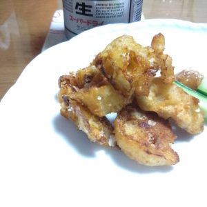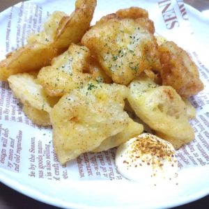 天ぷら衣に、明太子とマヨネーズを入れて揚げます。