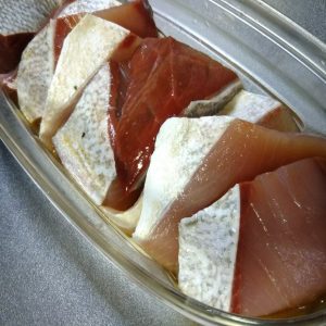 ショウガ、地酒、少しお醤油、ハーブソルトなどにつけた後、