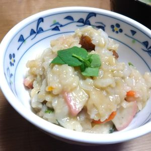 炊きあがったら、刻んだ七草(葉っぱ)を入れて、