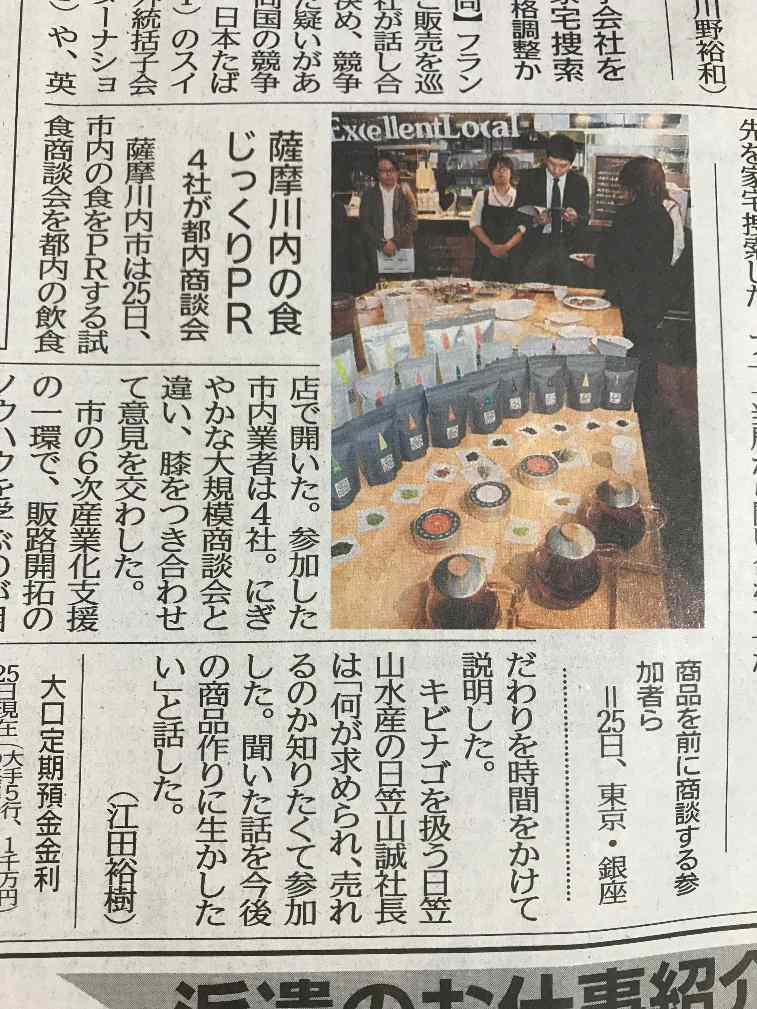 PRマッチング商談会 2018年01月27日2025年09月30日 ワイズプラス代表 森好子 東京にて、薩摩川内市のPRマッチング商談会を行いました。 一般的な商談会と違って、事業者さんとバイヤーさんが 膝をつき合わせて話をする場となりました。 ご協力くださいました関係者の皆様、ありがとうございました。 これで、一歩前進です。 今年度の事業はこれで終了ですが、 また来年度も続けていけるよう、頑張ります。 森好子 ※その様子を1月26日付け南日本新聞で記事にしていただきました。 南日本新聞の記事