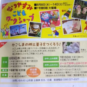 あ、こんなところに! 2018年07月15日2025年09月18日 ワイズプラス代表 森好子 山形屋から届いたチラシを眺めていたら・・・ 夏休みこどもワークショップ 夏休みもお盆前後は子どもたち向けのイベントが盛りだくさん。 8月9日には芝ちゃんの郷土菓子つくり教室があるようです。 芝ちゃんは、株式会社ワイズプラスのお手伝いもしてくれていて、 いま、MBCテレビのかごしま4で郷土料理のコーナーも担当しています。 申込みは今日! 早いもの順です。 興味ある方は是非♪ 森好子