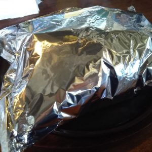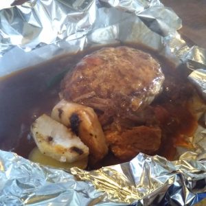 ホイルをナイフで破ると、熱々のハンバーグ♪ビーフシチュー添え♪