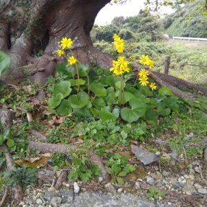 最近あちこちで見かけるツワブキの花。