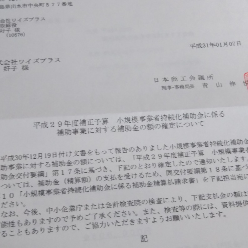 最終書類提出終わりました 2019年01月11日2025年09月30日 ワイズプラス代表 森好子 昨年末に報告書を提出していた 小規模事業者持続化補助金。 仕事納めの日に書類の不足があったと連絡があり、 年明けすぐ追加書類を提出しました。 そして、昨日、審査が終わって最終書類が届いたので、 記入してすぐに郵便局へ。 配達記録で発送し、業務が完了しました。 最終書類 補助金を活用して作ったラボ。 食と農に携わる方々のために しっかりと役立てていきたいと思います。 これからがスタートです。 森好子