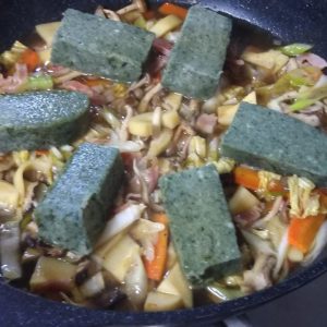 お餅を野菜の上にのせて、フタをして、お餅が柔らかくなるまで。